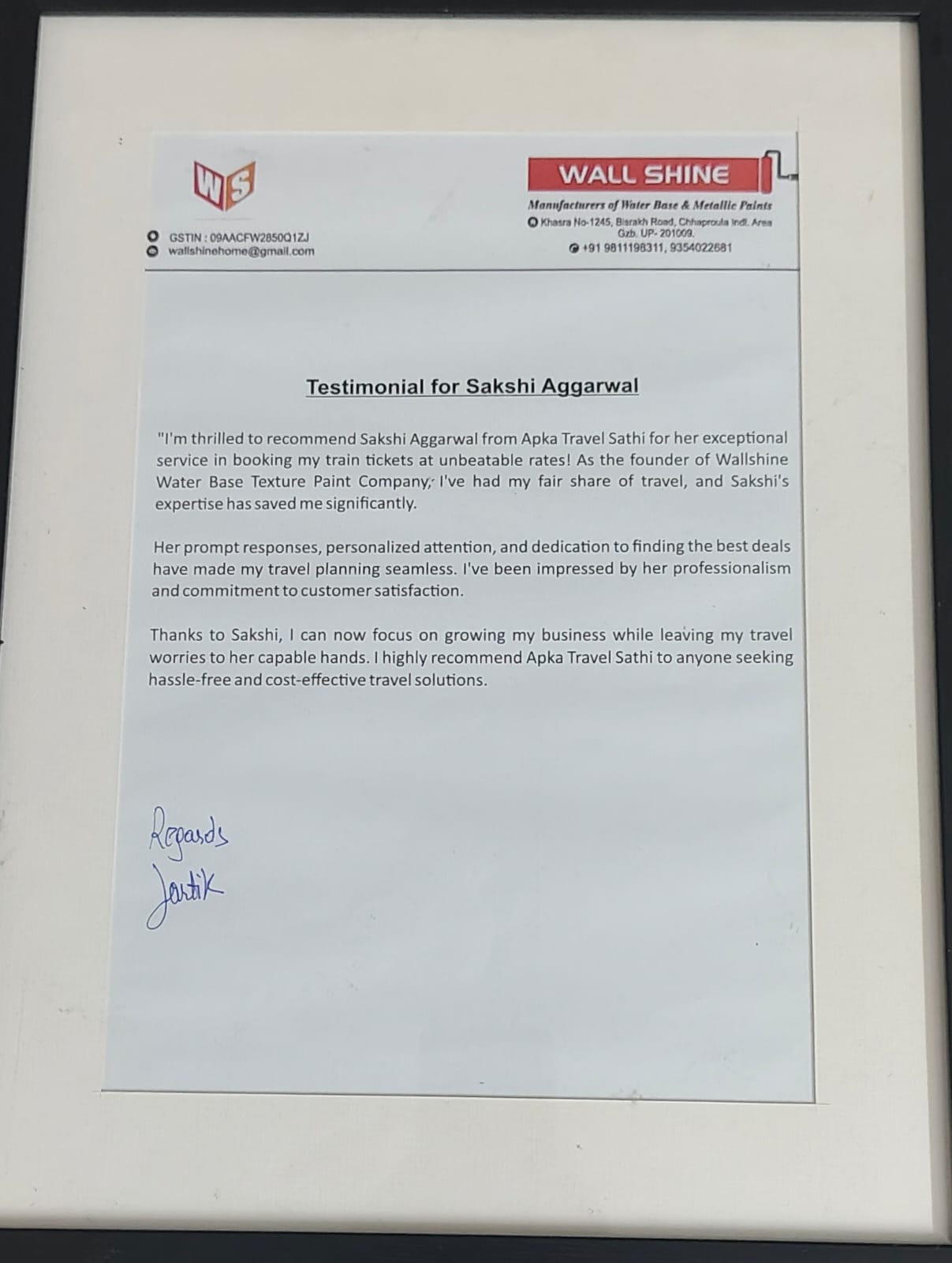 Best Travel Experience with Aapka Travel Sathi"I'm thrilled to recommend Sakshi Aggarwal from Apka Travel Sathi for her exceptional service in booking my train tickets at unbeatable rates! As the founder of Wallshine Water Base Texture Paint Company, I've had my fair share of travel, and Sakshi's expertise has saved me significantly. Her prompt responses, personalized attention, and dedication to finding the best deals have made my travel planning seamless. I've been impressed by her professionalism and commitment to customer satisfaction. Thanks to Sakshi, I can now focus on growing my business while leaving my travel worries to her capable hands. I highly recommend Apka Travel Sathi to anyone seeking hassle-free and cost-effective travel solutions."