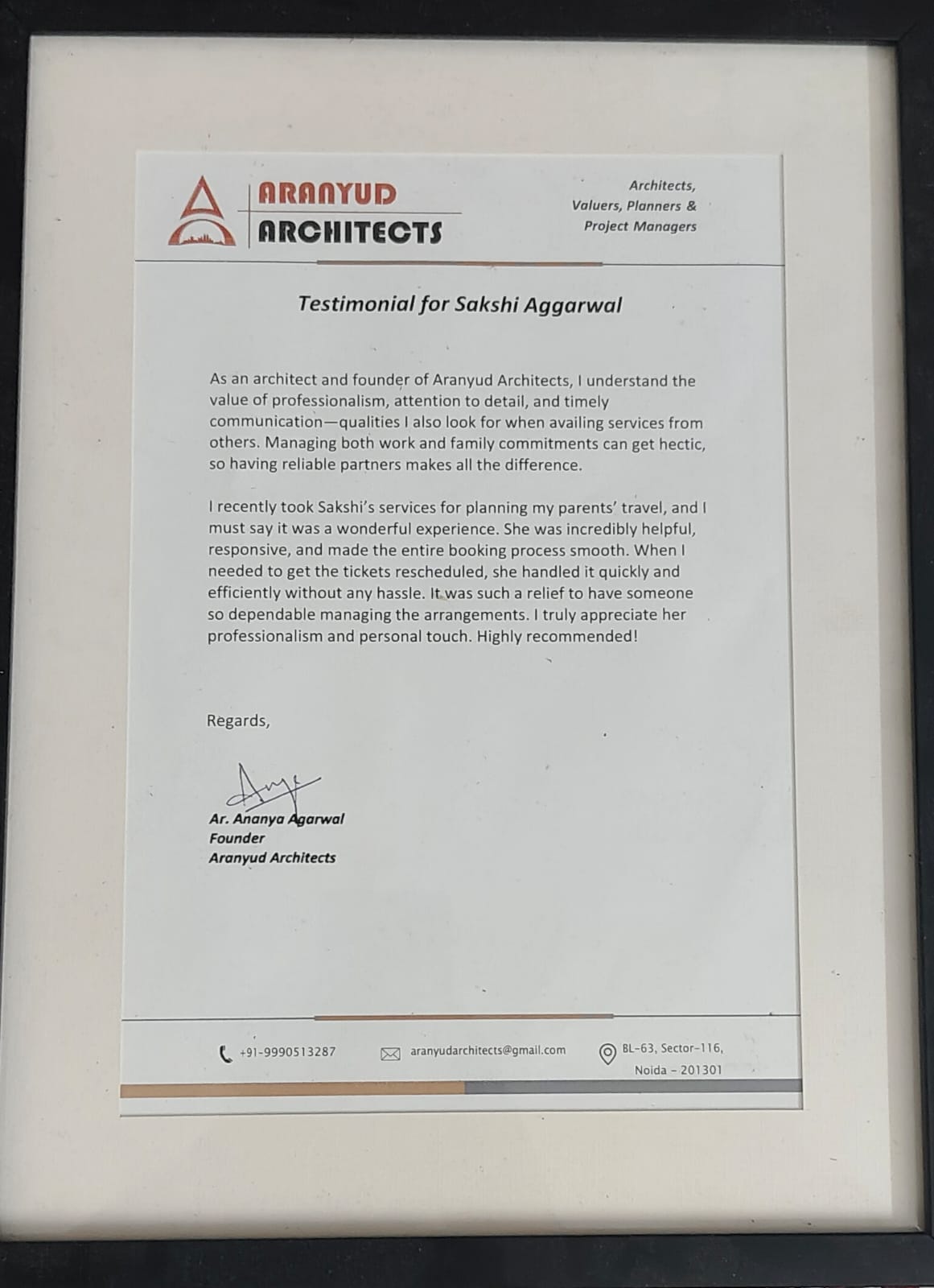 Very PromptAs an architect and founder of Aranyud Architects, I understand the value of professionalism, attention to detail, and timely communication—qualities I also look for when availing services from others. Managing both work and family commitments can get hectic, so having reliable partners makes all the difference. I recently took Sakshi’s services for planning my parents’ travel, and I must say it was a wonderful experience. She was incredibly helpful, responsive, and made the entire booking process smooth. When I needed to get the tickets rescheduled, she handled it quickly and efficiently without any hassle. It was such a relief to have someone so dependable managing the arrangements. I truly appreciate her professionalism and personal touch. Highly recommended!