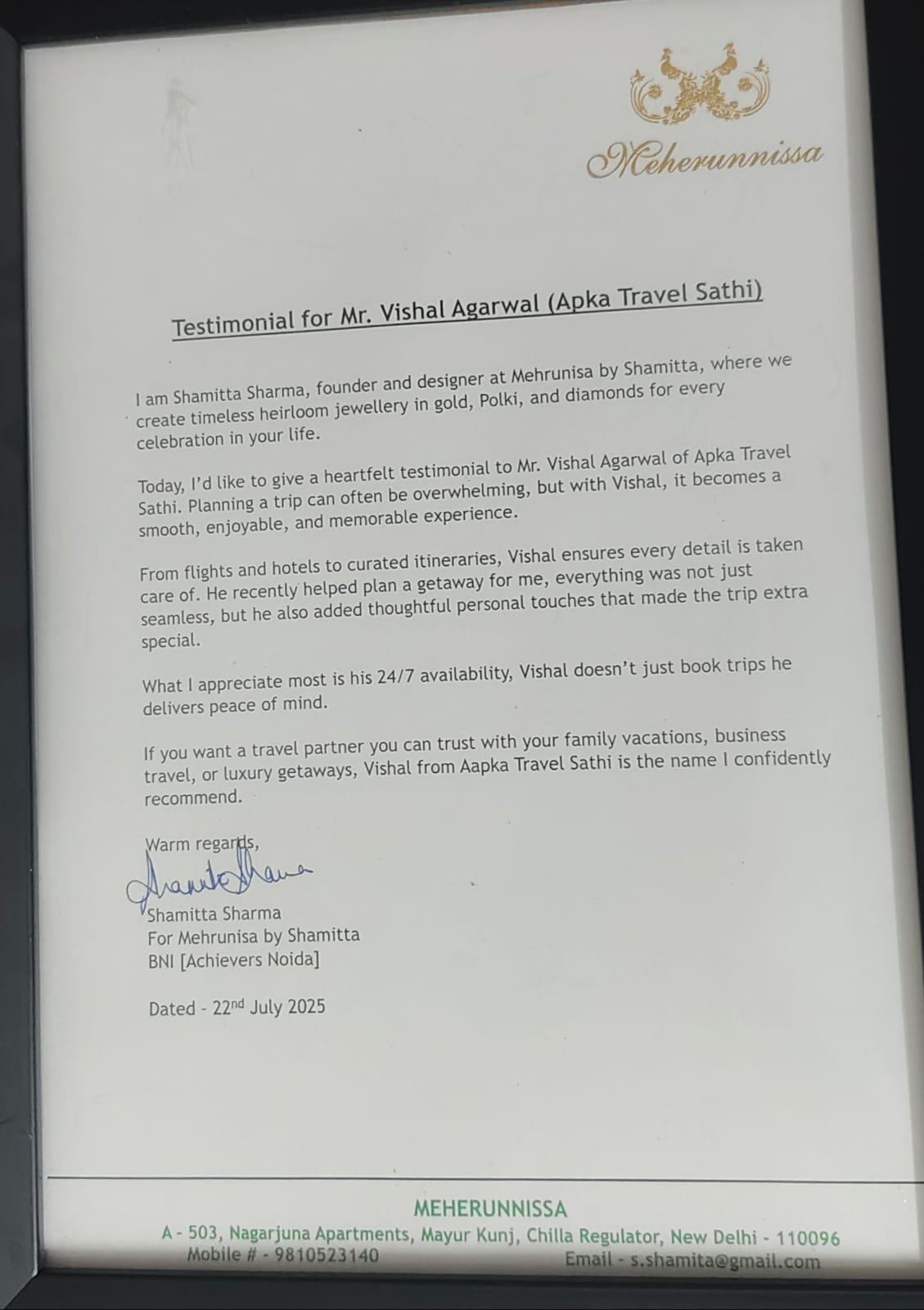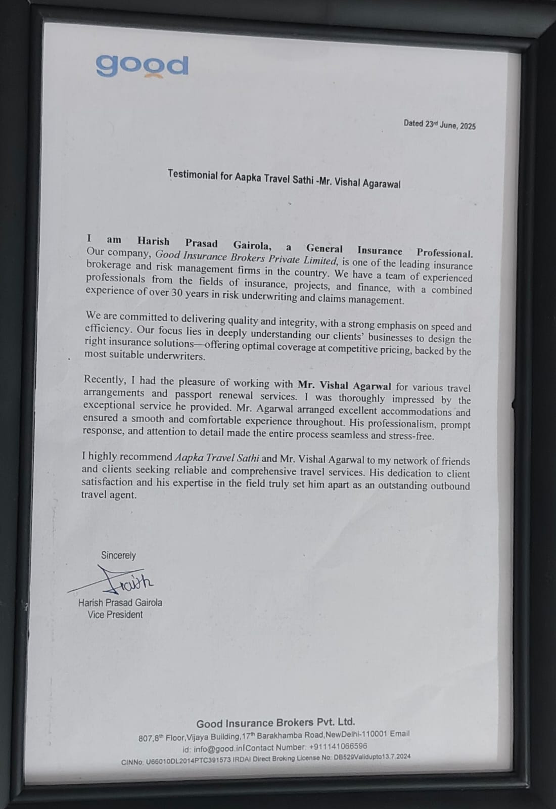 comfortable experience with Vishal Aggarwal from Aapka Travel SathiWe are pleased to share that a few months back we had referred Sakshi Aggarwal from M/s Aapka Travel Sathi to one of our known, Mr. R. P. Agarwal and his family. It gives me immense pleasure to share that the services delivered by Sakshi & her team not only exceeded Mr. R. P. Agarwal’s expectations but in some areas where timelines were tight, the team of M/s Aapka Travel were able to manage the reservations and were able to deliver the services which were personalised. We would thus recommend that if you are looking for any type of domestic travel which not only includes leisure packages by Sea, Train or Air but also pilgrimage, one should connect with M/s Aapka Sathi Travel for hassle-free personalised services.