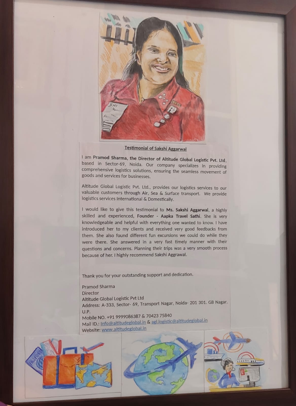 Altitude Global Logistic Pvt. Ltd. provides our logistics services to our valuable customers through Air, Sea & Surface transport. We provide logistics services Internationally & Domestically. I would like to give this testimonial to Ms. Sakshi Aggarwal, a highly skilled and experienced Founder – Aapka Travel Sathi. She is very knowledgeable and helpful with everything one wanted to know. I have introduced her to my clients and received very good feedback from them. She also found different fun excursions we could do while they were there. She answered in a very fast, timely manner with their questions and concerns. Planning their trips was a very smooth process because of her. I highly recommend Sakshi Aggarwal.
