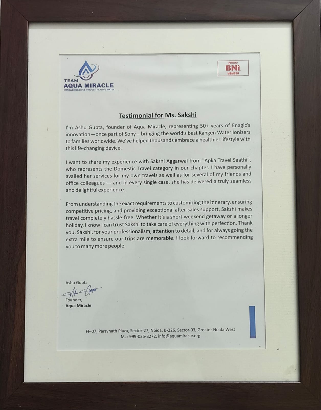 Testimonial for Vishal Aggarwal – Aapka Travel SathiI want to share my experience with Sakshi Aggarwal from "Aapka Travel Saathi", who represents the Domestic Travel category in our chapter. I have personally availed her services for my own travels as well as for several of my friends and office colleagues — and in every single case, she has delivered a truly seamless and delightful experience. From understanding the exact requirements to customizing the itinerary, ensuring competitive pricing, and providing exceptional after-sales support, Sakshi makes travel completely hassle-free. Whether it’s a short weekend getaway or a longer holiday, I know I can trust Sakshi to take care of everything with perfection. Thank you, Sakshi, for your professionalism, attention to detail, and for always going the extra mile to ensure our trips are memorable. I look forward to recommending you to many more people.