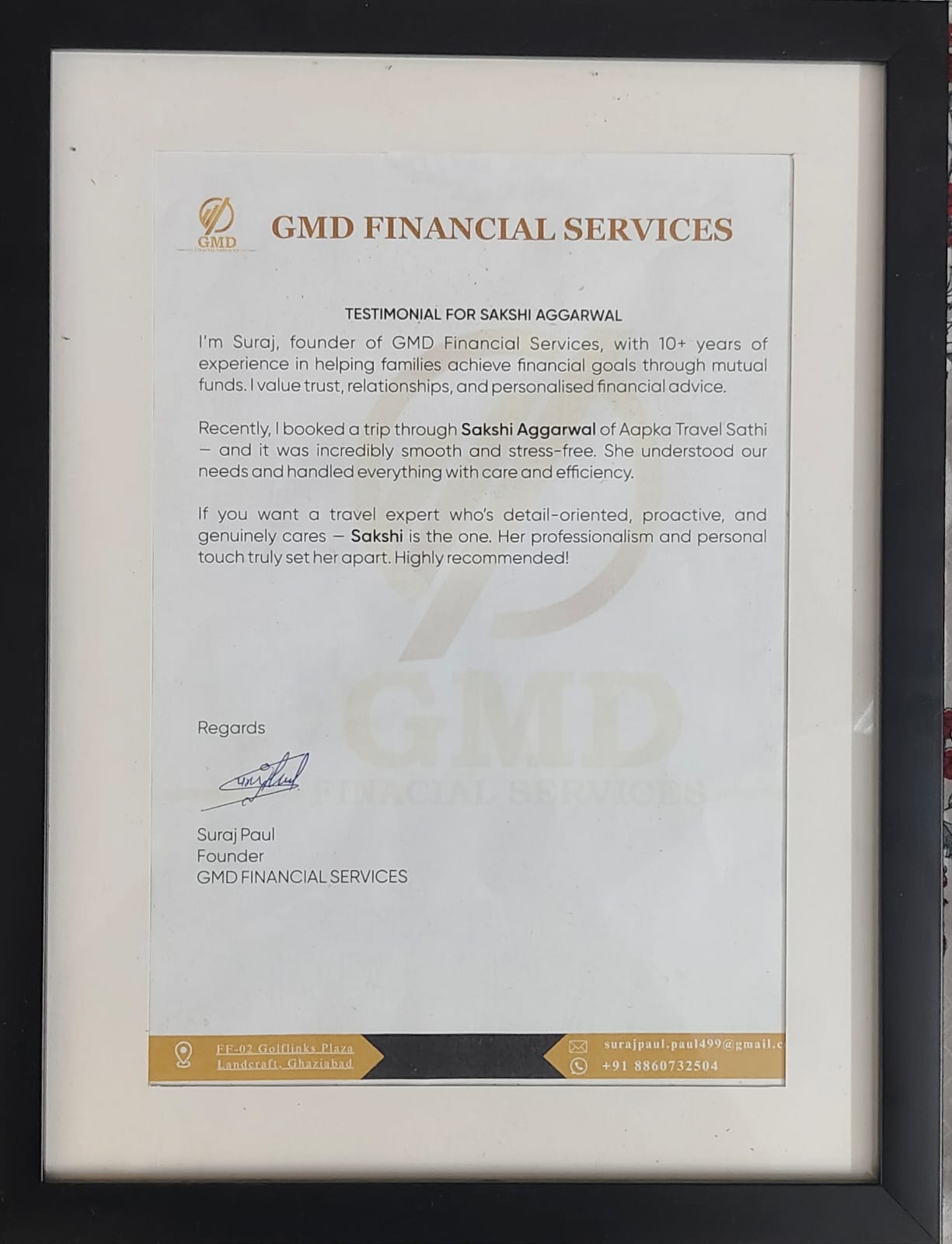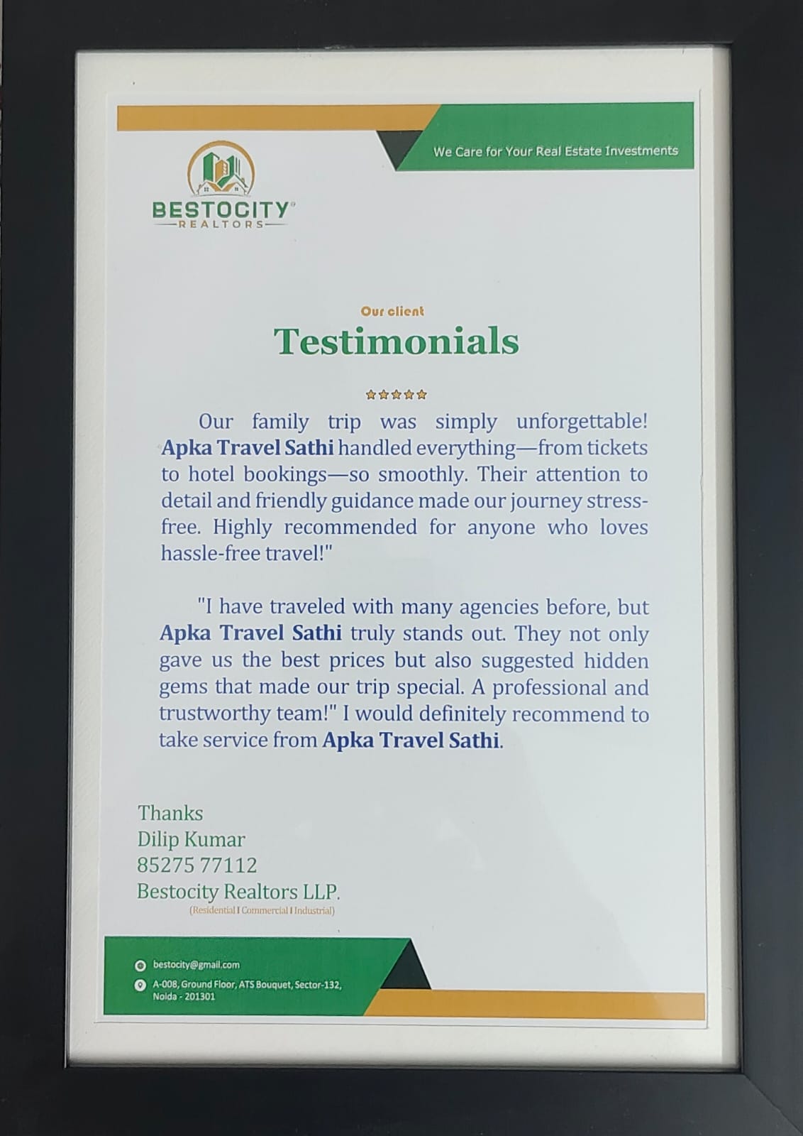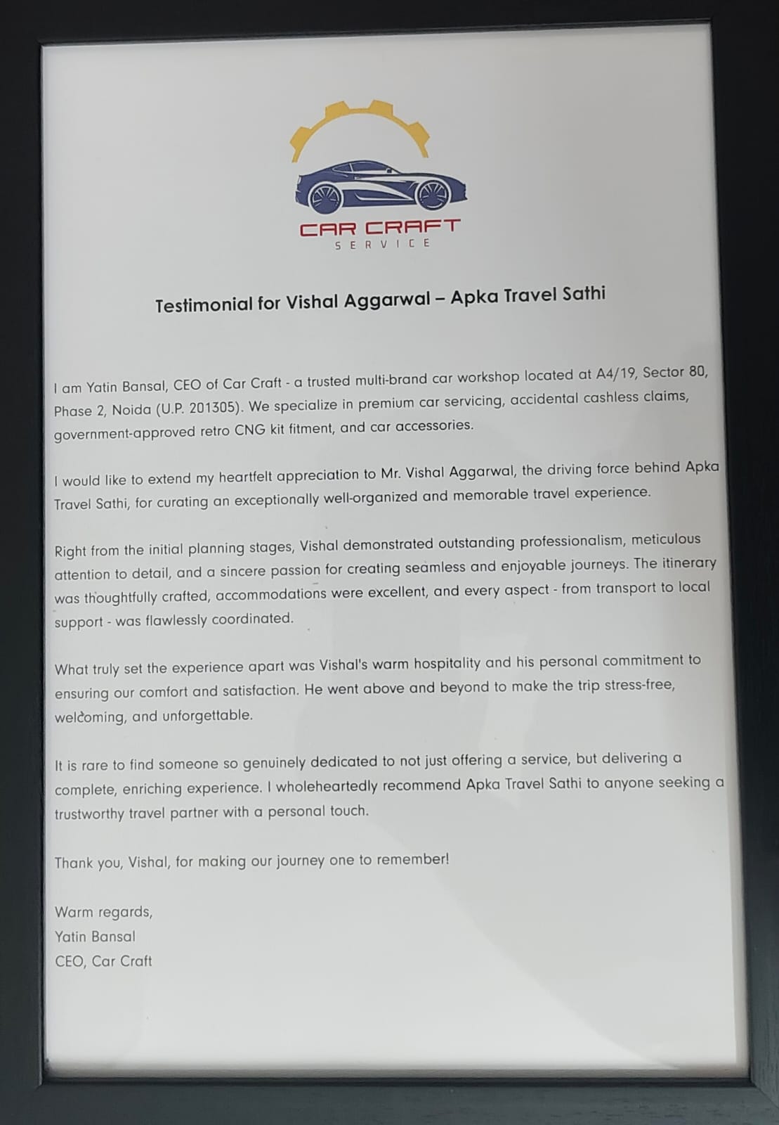Testimonial for Sakshi Aggarwal – Aapka Travel SathiRight from the initial planning stages, Vishal demonstrated outstanding professionalism, meticulous attention to detail, and a sincere passion for creating seamless and enjoyable journeys. The itinerary was thoughtfully crafted, accommodations were excellent, and every aspect – from transport to local support – was flawlessly coordinated. What truly set the experience apart was Vishal’s warm hospitality and his personal commitment to ensuring our comfort and satisfaction. He went above and beyond to make the trip stress-free, welcoming, and unforgettable. It is rare to find someone so genuinely dedicated to not just offering a service, but delivering a complete, enriching experience. I wholeheartedly recommend Apka Travel Sathi to anyone seeking a trustworthy travel partner with a personal touch.