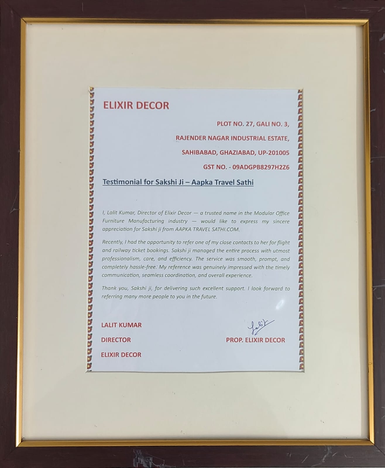 Best Travel ExperienceRecently, I had the opportunity to refer one of my close contacts to her for flight and railway ticket bookings. Sakshi ji managed the entire process with utmost professionalism, care, and efficiency. The service was smooth, prompt, and completely hassle-free! My reference was genuinely impressed with the timely communication, seamless coordination, and overall experience. Thank you, Sakshi ji, for delivering such excellent support. I look forward to referring many more people to you in the future.