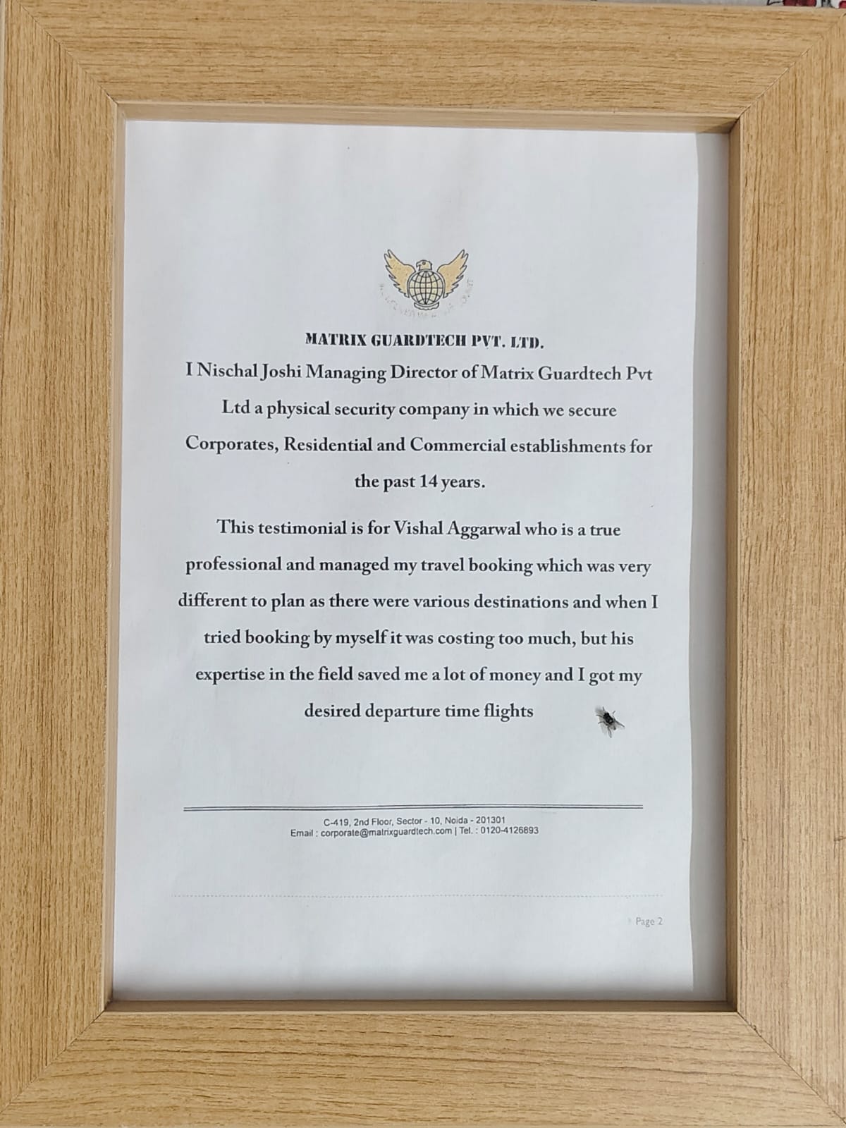 I, Nischal Joshi, Managing Director of Matrix Guardtech Pvt. Ltd, a physical security company in which we secure Corporates, Residential and Commercial establishments for the past 14 years. This testimonial is for Vishal Aggarwal who is a true professional and managed my travel booking which was very different to plan as there were various destinations and when I tried booking by myself it was costing too much, but his expertise in the field saved me a lot of money and I got my desired departure time flights.